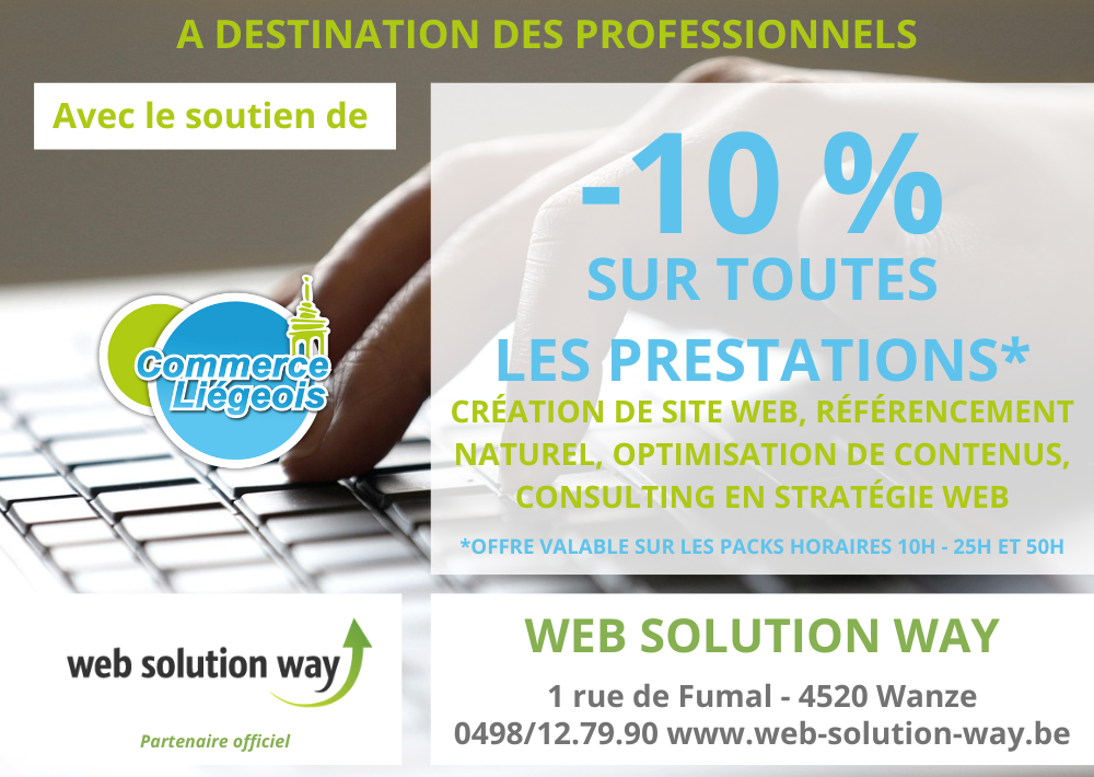 En tant que membre cotisant de la SR Le Commerce Liégeois ASBL, vous bénéficiez désormais d’un avantage privilégié pour développer votre présence en ligne. Notre partenaire Web Solution Way, vous offre une réduction de 10 % sur ses prestations (création de site web, référencement naturel, optimisation de contenus et consultance en stratégie web). Cette remise exceptionnelle est applicable sur les packs horaires de 10h, 25h et 50h, vous permettant d’accéder à une expertise de pointe pour propulser votre activité sur le digital à moindre coût.